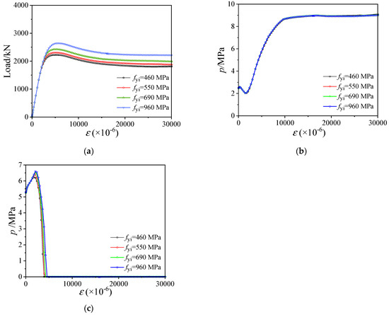 Influence of fyo at the water depth of 300 m. (a) Load–displacement curves; (b) Confining stress between outer stainless steel tube and sandwich concrete; (c) Confining stress between inner carbon steel tube and sandwich concrete.