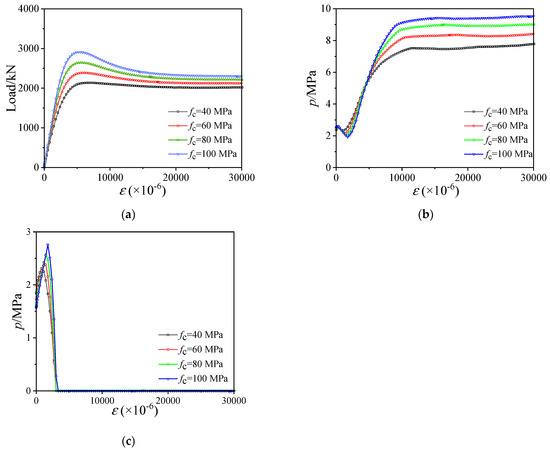 Influence of fc at the water depth of 300 m. (a) Load–displacement curves; (b) Confining stress between outer stainless steel tube and sandwich concrete; (c) Confining stress between inner carbon steel tube and sandwich concrete.