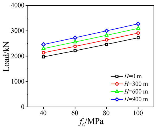 Figure 18 and Figure 19 display the influences of concrete strength fc. As shown in Figure 18a, increasing the strength of fc greatly improves the axial compression capacity of SCCDST members. However, it also accelerates the degradation trend of the post-peak stage due to the brittleness of high-strength concrete. Regarding the effect on confining stress in Figure 18b, enhancing the concrete strength fc can slightly reduce interfacial interaction during the pre-peak stage (axial strain < 5000 με) owing to the decreased confinement coefficient; thereafter, the evolution trend is reversed, because the higher the strength of the concrete, the more prone it is to brittle failure, resulting in increased lateral deformation and increased contact pressure on the steel tube. The change in confining stress of the inner steel tube to sandwich concrete is also the same (Figure 18c). Increasing fc causes a linear increase in bearing capacity, as depicted in Figure 19, e.g., enhancing fc from 40 MPa to 60 Mpa, 80 Mpa, and 100 Mpa at the water depth of 300 m respectively increases the axial compression strength by 11.68%, 23.70%, and 36.21%. On the other hand, the axial bearing capacity is respectively improved by 6.75%, 13.53%, and 20.11% while gradually deepening water depth from 0 m to 900 m at the condition of fc = 100 Mpa. Influence of water depth (i.e., the hydraulic pressure) on the load-carrying capacity is significant and should be taken into consideration.
