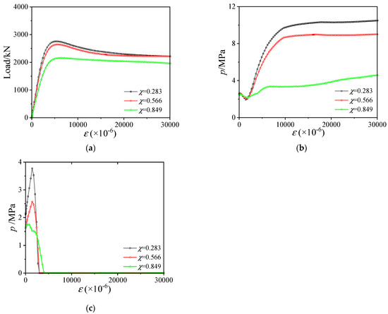 Influence of χ at the water depth of 300 m. (a) Load–displacement curves; (b) Confining stress between outer stainless steel tube and sandwich concrete; (c) Confining stress between inner carbon steel tube and sandwich concrete.