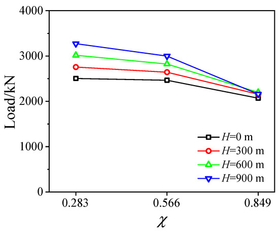 Influences of hollow ratio χ are displayed in Figure 20 and Figure 21, where altering the hollow ratio is conducted by changing the diameter of the inner tube while keeping the diameter of the outer tube consistent. The results in Figure 20b,c indicate that a higher hollow ratio (e.g., χ = 0.849) obviously reduces the composite behavior between double-skin tubes and sandwich concrete due to the decreased cross-sectional stiffness, thereby resulting in a decline of bearing capacity (Figure 20a), e.g., the capacity is reduced by 4.06% and 21.75% when increasing the hollow ratio from 0.283 to 0.566 and 0.849 in the case of water depth of 300 m. Moreover, regarding the influence of water depth, a marginal variation exists in the case of the greater water depth (e.g., H = 900 m) for the SCCDST members with larger hollow ratios (e.g., χ = 0.849), reflecting that necessary measures should be conducted to control the hollow ratio in the deep-water environment where the maximum allowable hollow ratio should be stricter than that of land engineering.