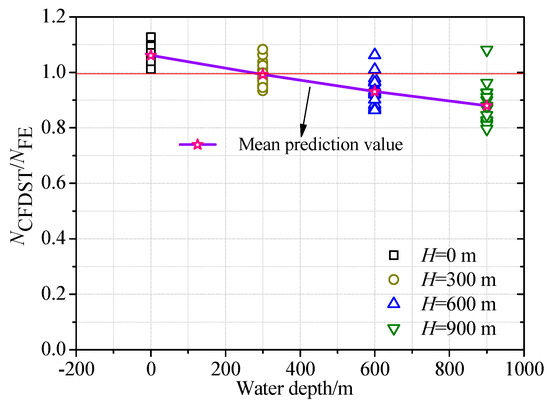 Based on the calculated results (NFE) of the FE model, a verification and comparison study on SCCDST members with external hydraulic pressure was conducted to validate the applicability of the aforementioned method for composite strength fosc and axial bearing capacity NCFDST. The validation results are shown in Figure 22, from which it can be observed that the accuracy of the existing design method predicts a gradual decline trend with increasing water depth, reflecting that the current design methods based on terrestrial engineering specifications have become difficult to apply in evaluating the safety of deep-sea engineering bearing capacity. Hence, to evaluate the axial compression capacity of SCCDST members under deep-water hydraulic pressure, a modified method was established by nonlinear regression analysis for reflecting the influence of various depths (i.e., pressures):