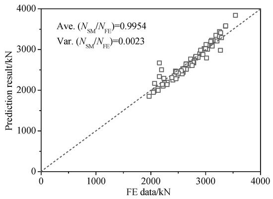 where NSM is the modified load-carrying capacity for SCCDST members with hydraulic pressures. To further verify the accuracy of the modified method in Equation (19), it was also compared to the finite element results, as shown in Figure 23. Results indicate that the modified method predicts well with the capacities of SCCDST members under hydraulic pressures by obtaining an average value (NSM/NFE) of 0.9954. Considering the current lack of research on the SCCDST structure in deep-water environments, the above modified method can be used as a preliminary reference for engineering design and safety evaluation.