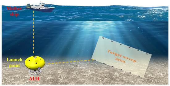 Various works have been conducted related to mechanical design [2], motion stability analysis [3,4], streamlined contour optimization [5,6], motion controller design [7,8] and so on. However, there are comparatively few studies focused on AUH’s operation control and autonomous path planning. Survey and observation in an interesting sea area with some acoustic and optical equipment is one of its typical application scenarios. In AUH’s near-bottom survey or observation missions, it is necessary for AUH to sweep a certain seafloor area autonomously, even though the underwater environment is unfamiliar or unknown in advance. In this circumstance, the obstacle avoidance and autonomous Complete Coverage Path Planning (CCPP) are essential functions for AUH to implement its assigned tasks. A hypothetical working scenario of AUH is shown in Figure 1.