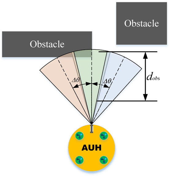 During the simulation process, the obstacle information is unknown to AUH’s decision controller, and its range to the obstacle is obtained through continuous intersection computation with the obstacles’ boundaries. The entire distance measurement procedure is given in Figure 7.