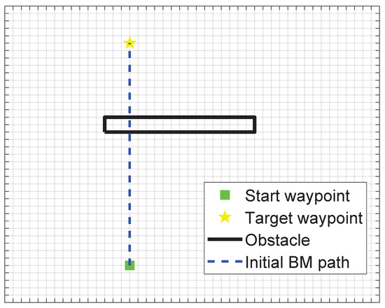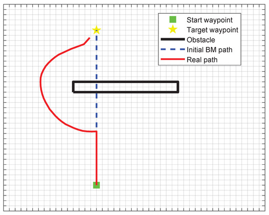 As shown in Figure 6, the initial BM designed path is blocked by an obstacle, and AUH is not available to move directly to the target waypoint from the current start position. During AUH’s sailing, once the obstacle is detected by its single-beam range sensor (echo sounder), it enters the obstacle avoidance procedure: the multiple distance measurement and heading determination at its current position.
