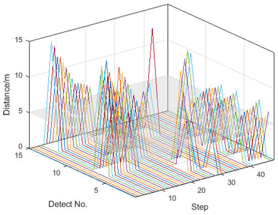 As shown in Figure 4, taking advantage of AUH’s horizontal maneuverability, it turns at different directions in an angle step of . The distance information can be obtained in each direction with a single beam echo sounder. Assembling these distance data, obstacle information against AUH’s current position is perceived, which is similar to the function of a multi-beam sonar.