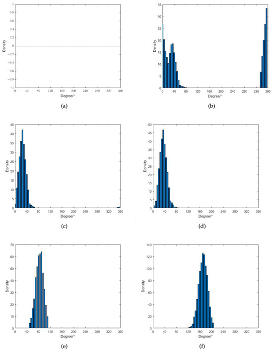 The polar histogram at AUH’s various move steps during the obstacle avoidance procedure. (a) Step 13; (b) Step 14; (c) Step 19; (d) Step 21; (e) Step 30; (f) Step 45.