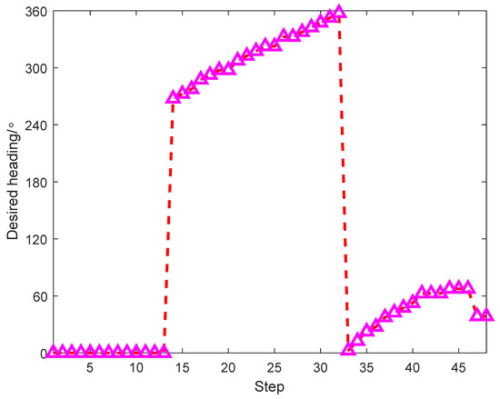 AUH’s final simulated sail track is illustrated in Figure 12b. Comparing Figure 12b with Figure 11b, it can be observed that, though the first obstacle is placed in the same position in the operation area with the same size, AUH chooses a different heading direction to bypass it. This difference is due to the existence of Obstacle 2. When AUH probes Obstacle 1, Obstacle 2 near it is also detected. The information of these two concurrent obstacles is transferred to the VFH+ algorithm, and the desired heading during this period can be seen and compared in Figure 13. According to the desired heading angle, it turns right to circumvent Obstacle 1 in simulation case 1 (Figure 13a), while it turns right in simulation case 2 (Figure 13b). This difference demonstrates that the VFH+ algorithm can effectively avoid AUH becoming trapped in a dead-end, and the designed trajectory becomes smoother and more reliable.