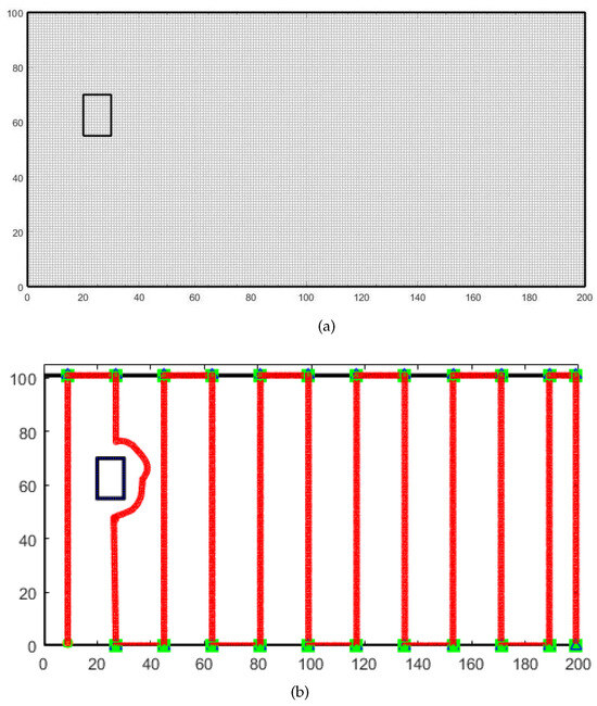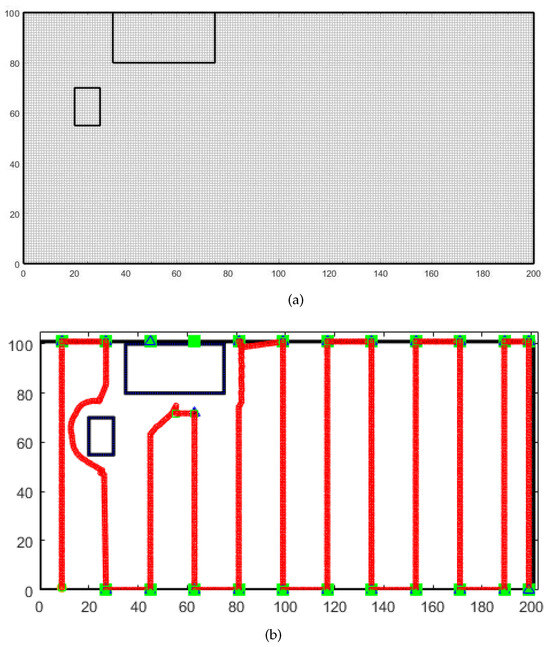 Another simulation case is established as illustrated in Figure 12a. More obstacles are placed in the sweeping area. Similar path planning process is conducted to fulfill the sweep area complete coverage.