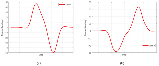 The variation of heading decision around obstacles in different cases. (The heading angle in (180, 360] is mapped to (−180, 0]) for convenience. (a) Simulation case 1; (b) Simulation case 2.