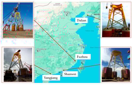 The foundation of offshore wind turbines can account for up to 35% of the installation cost. Therefore, the design of the foundation plays a crucial role in the economics of the project []. It is important to select the appropriate form of foundation for the development of offshore wind farms. The suction bucket jacket foundation has numerous advantages for offshore wind energy. It is characterized by high vertical stiffness, excellent stability, strong environmental adaptability, ease of installation, and an absence of noise pollution. Its application in the offshore wind energy sector is becoming increasingly widespread [,,,,,]. The suction bucket jacket foundation is considered a significant alternative to traditional single pile foundations and pile-supported jacket foundations for constructing offshore wind farms in water depths ranging from 30 m to 50 m []. Figure 1 shows successful applications of the foundation in Chinese offshore wind farms.