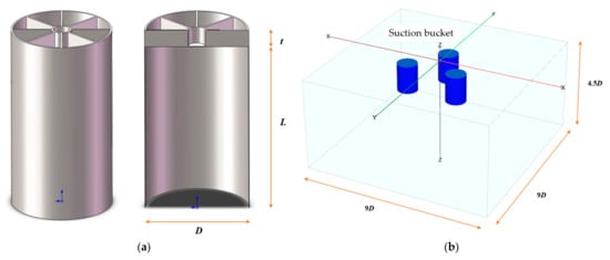 The prototype bucket design model of the suction bucket foundation used in real engineering is shown in Figure 2a. The suction bucket foundation is a steel structure with stiffeners at the top. Plate elements are used to simulate the bucket in the finite element model. The Von Mises yield criterion was applied, with a Young’s modulus of 210 GPa, a Poisson’s ratio of 0.3, and a density of 7850 kg/m3 for the material. The computational analysis of the finite element model is shown in Figure 2b. To simulate the enhanced stiffness of the top of the suction bucket by the reinforced plate in the prototype bucket and to simplify the model, the finite element model used a top plate with increased thickness instead of the top of the prototype bucket. A thorough analysis of the boundary effects on the results was conducted to establish simple and rational boundary conditions [], while ensuring computational accuracy. First, the radial boundaries are set to 10D, 9D, 8D, 7D, and 6D, respectively, for calculation. The analysis revealed that changes in the radial boundary had minimal impact on the results, with results nearly identical for radial boundaries set at 9D and 10D, leading to the determination of the radial boundary as 9D. Subsequently, the depth direction boundary was adjusted to 5.5D, 5D, 4.5D, 4D, 3.5D, and 3D for calculations. The results indicated that the calculation results started to deviate when the depth direction boundary was less than 4D. As a result, the depth boundary was determined to be 4.5D. To simulate the soil plug of the undrained pullout process, the inner side of the suction bucket foundation was bound to the foundation soil [], while the outer side was modeled with frictional contact that cannot detach in the normal direction []. The soil’s upper surface was free, and a 30 m head was applied. Only vertical displacement was permitted on the side surfaces, and the bottom was entirely fixed. The spacing between the buckets was set to 2.2 times the diameter of the bucket in order to disregard the combined impact of the grouped buckets [].