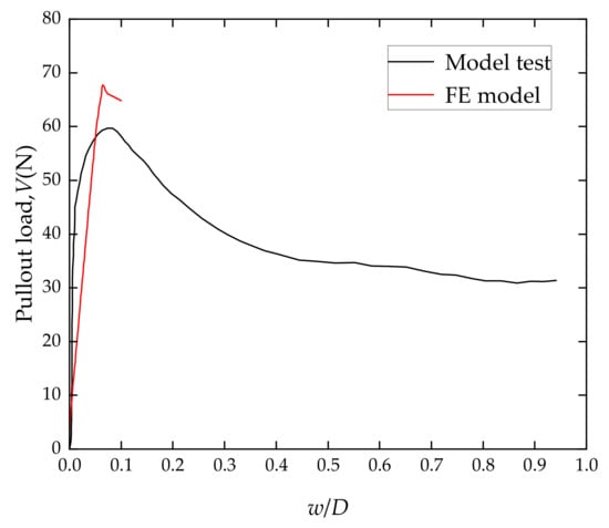 To verify the accuracy of the numerical model, we conducted a comparative analysis with the physical model test performed by Hong et al. []. Hong’s experiment was conducted on loose sandy soil with a bucket diameter of 150 mm, a length of 150 mm, a side wall thickness of 1 mm, and a top wall thickness of 5 mm. The bucket was uniformly lifted at a speed of 2.5 mm/s. As shown in Figure 3, the finite element simulation modeled the uplift process of 0.1D for this setup. The results show a peak pullout load error within 10%, which occurs around 0.08D. The results of the physical model test indicate that the finite element estimation of the pullout capacity is accurate, supporting further research.