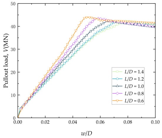 This study analyzes the pullout capacity of the suction bucket jacket foundation under undrained conditions with a pullout rate of 0.25 m/s, satisfying the condition Fd ≥ 1. Figure 4 shows the uplift load–displacement curves in medium-dense sand for buckets with different L/D ratios. The pullout displacement (w) is normalized to the suction bucket foundation diameter (D). The pullout load–displacement curves for different L/D ratios show similar trends. In the initial stage, the pullout resistance increases rapidly with displacement and then gradually decreases after reaching its peak. This is consistent with previous research [,,]. The phase before the appearance of the maximum pullout force is considered the pre-failure phase, and the phase after the appearance of the maximum pullout force is considered the post-failure phase. The displacement at which the maximum pullout force occurs is referred to as the failure displacement. The maximum pullout force and failure displacement for each bucket foundation are shown in Table 4.