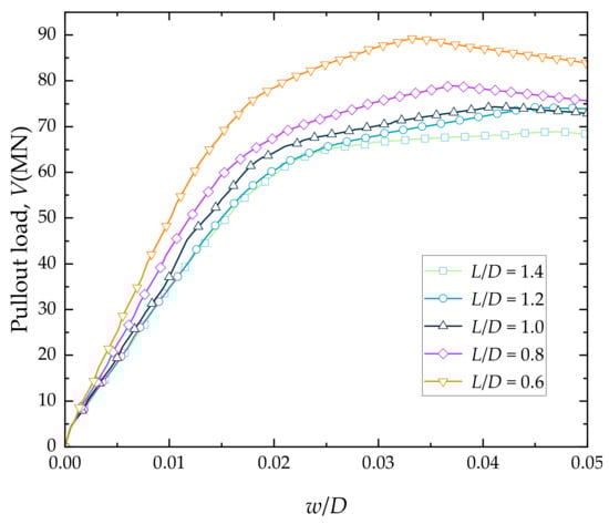 The pullout load–displacement curves of the bucket for different L/D ratios in soft clay.