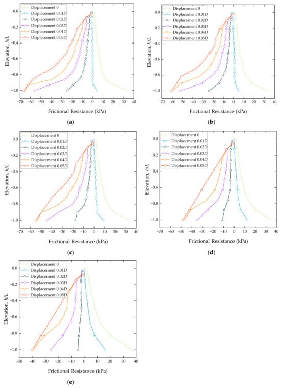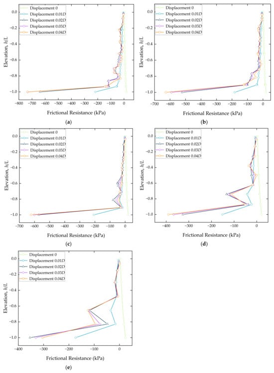 Distribution of frictional resistance on the outer wall of the bucket foundation at different L/D ratios in sandy soil. (a) L/D = 1.4; (b) L/D = 1.2; (c) L/D = 1.0; (d) L/D = 0.8; (e) L/D = 0.6.