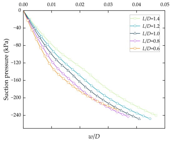 Combining Figure 4 and Table 4, it can be observed that under the condition of constant bucket mass, smaller L/D results in a larger peak pullout load and a higher initial stiffness. From L/D = 1.4 to L/D = 0.6, the increase in peak pullout load is 4.4%. This is due to the fact that during the undrained pullout process, the failure mode of the foundation soil is overall failure. The influence of the soil below the bottom of the bucket on the pullout response is significant. As L/D decreases, the area of soil below the bottom of the foundation increases, resulting in a larger peak pullout load at the point of soil failure. In addition, at larger L/D ratios, the undrained shear strength of the soil below the suction bucket foundation is higher, making it less susceptible to yielding in the simulation, resulting in larger vertical displacements at the point where the peak pullout load is reached.