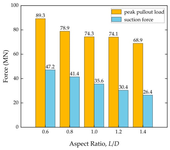 The suction force is generated by converting the pore water pressure at the bottom of the suction bucket’s lid. The suction force can be estimated by multiplying the pore water pressure by the cross-sectional area of the suction bucket lid []. Figure 9 shows a comparison between the peak pullout load and the corresponding suction force for the suction bucket at different L/D ratios. The data visually demonstrate the impact of the suction force at the bottom of the suction bucket lid on the peak pullout load. At L/D = 1.4, suction force accounts for 38.3% of the peak pullout load, and this proportion increases as L/D decreases. At L/D = 0.6, suction force accounts for over 50% of the peak pullout load. The reason for this is that reducing the L/D ratio decreases the frictional resistance between the suction bucket and the soil, resulting in a higher proportion of suction force in the peak pullout load.