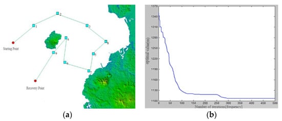 The parameter settings for the temporal sequence planning simulation are as follows. Within the UUV mission environment, the commander configures nine distinct task areas, as well as deployment and recovery points for the UUV, thereby establishing the conditions for the simulation tasks. The genetic algorithm’s parameter settings are as follows: a population size of N = 500, termination generation at T = 500, the crossover probability set to , and the mutation probability defined as . Figure 3 illustrates the optimized generated path and the iterative optimization curve.
