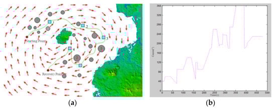 The re-planning results for UUVs experiencing an energy shortage (a) and the motion direction of the UUV (b).