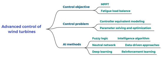 - Fuzzy Logic is primarily used to address the uncertainties and ambiguities in MPPT (maximum power point tracking). For instance, some studies have focused on developing fuzzy fractional-order proportional–integral controllers to enhance the performance of direct-drive permanent-magnet synchronous generator wind turbines. This highlights the flexibility of fuzzy logic in adapting to rapidly changing wind speed conditions [17]. Further research includes comparative analyses of different fuzzy logic controllers in semisubmersible platform wind turbines [18]. In addition, some research also involves comparing the performance differences between fuzzy logic control and the traditional proportional integral controller [19], and combining the fuzzy logic method of sliding mode control to improve the robustness and performance of doubly-fed induction generator systems [20]. Fuzzy logic offers effective solutions to wind turbine control in complex environments.
