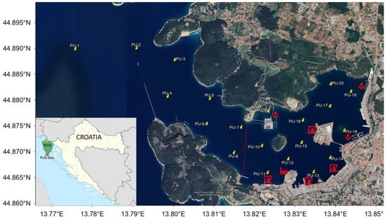 Four sampling campaigns were carried out in Pula Bay in 2021 and 2022, corresponding to the four seasons: summer (July 2021), autumn (November 2021), winter (March 2022) and spring (June 2022). Samples were taken at two depths: just below the surface (0.5 m; hereafter referred to as “surface samples”) and a few meters above the bottom of the water column (variable depths; hereafter referred to as “bottom samples”) with a home-made vertical “butterfly”-type water sampler (https://sites.google.com/site/daromasoft/home/sampler; accessed on 29 January 2024). Sampling was conducted at 20 locations (Figure 1): 19 inside the bay (PU-2 to PU-20) and 1 outside the bay, referred to as a reference site (considered unpolluted) (PU-1). Maximum depths are given in the supporting document (Table S1).