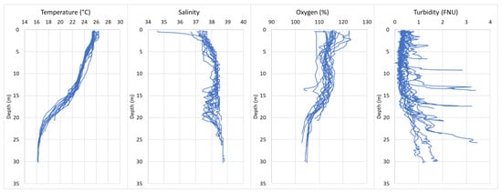Figure 2 shows the vertical profiles of the physico-chemical parameters measured during the July 2021 campaign: temperature, salinity, dissolved oxygen and turbidity. The graphs combine the vertical profiles of all sampling sites for the given parameter. We have avoided providing the legend of the plots here and assigning colors to the different sampling stations as it would be too difficult to follow the individual profiles. Thus, note that these profiles are only intended to show general trends. Profiles taken during other campaigns can be found in the supporting document (Figures S1–S3).