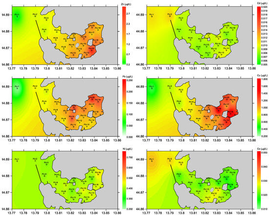 Figure 3 shows contour plots of a typical spatial distribution of the dissolved concentrations of the six analyzed TMs in the surface layer of the studied site, as determined for the July 2021 campaign. A clear increase in Zn, Cu and Pb concentrations was observed from the reference site (PU-1) toward the sites inside the bay.