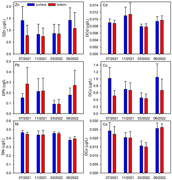 The average concentrations of the four campaigns shown in Figure 4 clearly show that the surface Zn and Cu concentrations were lower in the autumn and winter campaigns compared to the spring and summer campaigns. These differences are less pronounced in the bottom seawater layer, indicating limited vertical transport of Zn and Cu. The lowest dissolved concentrations of all metals (except Ni) found in the winter campaign (March 2022) for both layers could be ascribed to a higher exchange of water masses during the winter period with good vertical mixing, together with lower anthropogenic inputs due to the reduced number of activities within the harbor.