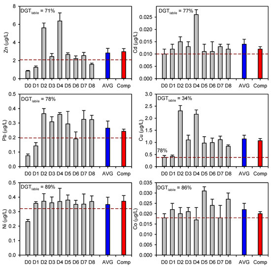 Dissolved concentrations of TMs in discrete samples taken daily during the DGT deployment period (D0–D8), average value (AVG) and the concentrations in the composite sample (Comp). The red dashed line corresponds to the DGT-labile concentrations. The percentages of DGT-labile fractions shown in the plots represent the portion of the DGT-labile concentration compared to the average dissolved concentration. Error bars represent the standard deviations of analytical measurements.