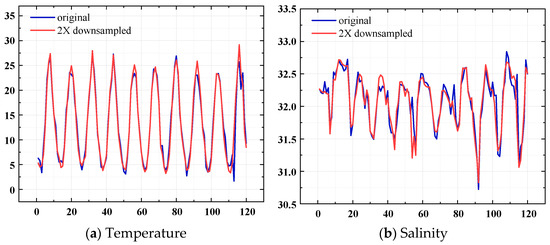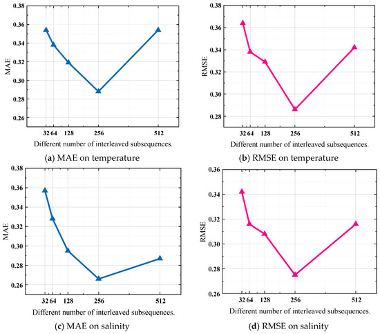 Different number of interleaved subsequences. Figure 7 illustrates the effect of the hyperparameter , highlighting the influence of the number of interlaced subsequences in data after downsampling on the predictive capabilities. From the experimental results in Figure 7a, it can be seen that the prediction accuracy improves as the number of interleaved subsequences increases. When the number of interleaved subsequences equals 256, the prediction accuracy is the best, indicating that a certain number of interleaved subsequences can effectively remove temporal redundancy in the dataset. When the number of interleaved subsequences exceeds a certain threshold, we should adjust other parameters to improve performance. Similar results were also observed on the salinity dataset in Figure 7c,d. Therefore, selecting an appropriate number of interlaced subsequences is crucial during the application of the model.