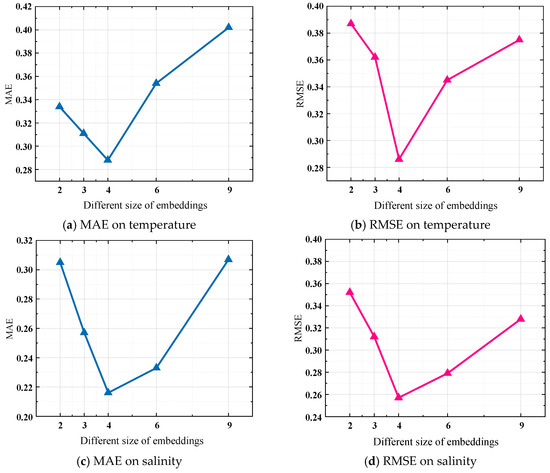 Figure 6 shows that embeddings that are too large and too small affect the ocean time series prediction performance in the ocean temperature and salinity datasets. At the same time, we observe that when embedding = 4, the model exhibits the most petite MAE and RMSE. As the size of the embedding increases, the evaluation metrics show an upward trend. These results intuitively demonstrate the optimal parameter selection of Ocean-Mixer, which can better help achieve ocean time series prediction.