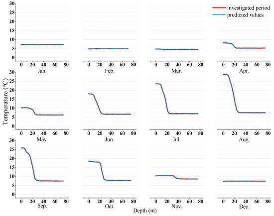 The Ocean-Mixer utilizes historical observations to achieve accurate predictions of ocean temperature in a 3D scenario by capturing the correlation between the time dimension and channels. Figure 8 illustrates the temperature prediction for the next 12 months (from 14 January to 14 December) using data from the previous 36 months, with a prediction step 12. Figure 8 covers data from 0 to 80 m from ocean depths, where the red curve represents the investigated period’s observed temperature values, and the blue curve shows the predicted temperature values.