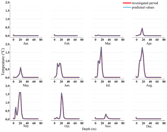 In Figure 9, the red and blue lines indicate the investigated period and predicted temperature gradients , respectively. Combining Figure 8 and Figure 9, the ocean temperature does not vary much with water depth during January, February, March, and December. However, from April onwards, the temperature fluctuations gradually increase with deeper water depth, especially in July, August, and September, when the temperature fluctuations peak, consistent with the real-world behavior of seasonal variations in the temperate ocean thermocline. This phenomenon also confirms the efficiency of our Ocean-Mixer model in capturing long-term time-series information and temperature trends, as well as its ability to fit nicely into real-world data.