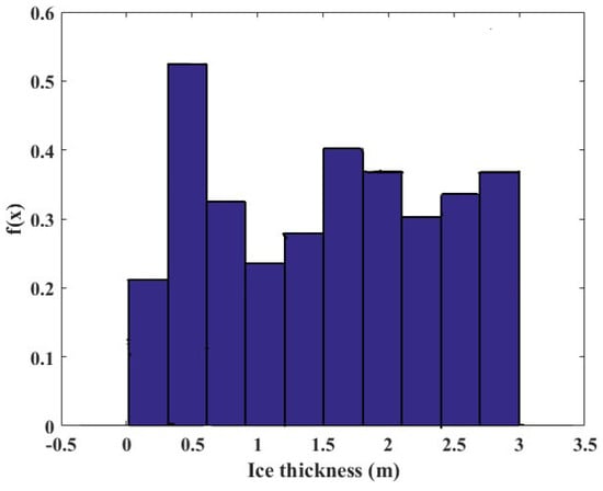 Thus, we can obtain the expression of function regarding the bandwidth h. Let be equal to a certain value, and we can then solve for the bandwidth . Therefore, the probability density function of Arctic sea ice thickness is as follows: