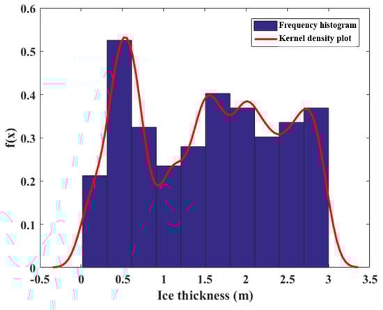Plotting the obtained kernel density estimation function onto a histogram of frequency distribution, we can compare the trends between the two. As shown in Figure 2, it can be observed that within the range of [0, 3], the trend of the kernel density estimation function is consistent with the variation pattern of the sea ice thickness, exhibiting an asymmetric and non-unimodal distribution, and there are no outliers present.