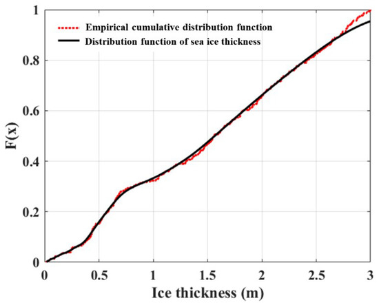 The probability density function of Arctic sea ice thickness in this paper cannot be directly obtained by an explicit expression of the distribution function. The K-S test is performed by comparing the values of and at the discrete point . Figure 3 shows the distribution function of sea ice thickness and the empirical cumulative distribution of the sample data. From the figure, it can be seen that has a stepwise increasing distribution, and with an increase in sample size, this stepwise property tends to become smoother. The fitting degree between and is good, and the curve is smooth without any outliers. Both show a consistent trend, gradually increasing from 0 to 1 monotonically, which conforms to the changing pattern of the distribution function of stochastic variables in nature. The maximum difference between the two occurs at , and the calculated test statistic is . By taking the confidence level and looking up the table based on the sample size n and confidence level , the critical value c is determined to be 0.0941. Since the test statistic is less than the critical value c, it can be concluded that the distribution law of Arctic sea ice thickness is consistent with the distribution function obtained by kernel density estimation in this paper.