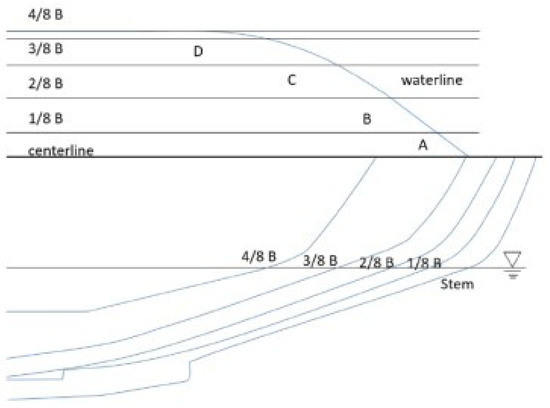 To conduct a numerical simulation of the ice failure process of icebreakers in ice fields, the software LS-DYNA was used to simulate the submarine up-floating ice failure process. The research object selected was the icebreaker “Xuelong 2” [37,38], and the ice field was built using the ice thickness data obtained by the rejection sampling method. The “Xuelong 2” icebreaker has a total length of 116 m, a width of 22 m, a maximum draft of 7.8 m when fully loaded, a waterline entry angle of 40°, and a bow pillar inclination angle of 20° at the bow position. The waterline and longitudinal section of the ship are shown in Figure 4.
