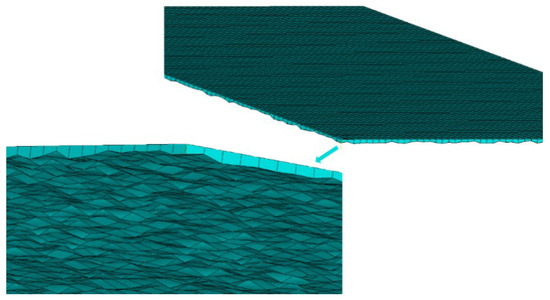 In the modeling process, referring to the waterline and longitudinal profile of the “Xuelong 2” icebreaker, a bottom-up modeling approach was used to sequentially establish key points that control the geometric shape of the ship’s bow, form smooth spline curves based on these key points, and preliminarily form the outline of the ship’s bow. According to these lines, the surface and body of the ship’s bow were formed. Secondly, the hull and stern of the icebreaker were established. Based on the total length of the icebreaker, appropriate key points were established, and the same approach was used to form the contours of the hull and stern. Finally, the complete model of the whole ship was established, as shown in Figure 5. A geometric model of an ice field is established by using a Monte Carlo method to generate stochastic ice thickness data ranging from 0 to 3 m, based on a 400 m × 300 m stochastic ice field, which models the real ice field, and considering fixed boundary conditions at the remote end. The specific process of establishing the ice field geometric model is as follows: (1) Let be the planar position coordinates of any point on the stochastic ice field, and let y be the thickness of the sea ice. (2) On the plane, with a fixed z coordinate, 61 key points are generated regularly at intervals of 5 m. The z coordinate is then increased by 5 m, and the above steps are repeated. This process is repeated until 4941 key points, each with a y-value obtained from the Monte Carlo method, are generated at regular intervals of 5 m. (3) Based on the regularity of the key point numbering, a loop command is used to connect the key points into regular lines, which are then used to form several curved surfaces. The entire irregular surface is dragged down 10 m along the negative y-axis to form a volume, and Boolean operations are performed on the working plane at to remove excess parts, thereby creating a geometric model of a stochastic ice field. See Figure 6 for an example. The use of an appropriate material model is one of the conditions for ensuring the accuracy of numerical simulation. This paper mainly studies the variation in ice loads caused by sea ice during the ice failure process of icebreakers, without considering the issue of hull damage. The numerical model treats the icebreaker as a rigid body [39].