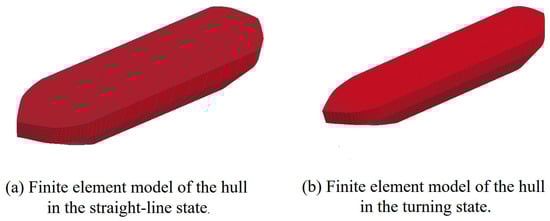 The finite element model of the icebreaker adopts 3D solid element SOLID164 and the mapping mesh partition method. The force situation of the icebreaker is different in the straight-line and turning states, and finite element models are generated for different navigation states. The finite element models of the icebreaker in the straight-line and turning states are shown in Figure 7. The first one contains 16,384 solid elements and 18,785 nodes, and the second one contains 19,456 solid elements and 22,049 nodes. The finite element model of a certain ice floe in a stochastic ice field adopts 3D solid element SOLID164 and the mapping mesh partition method. The finite element model of one ice floe is shown in Figure 8, which contains 129,600 elements and 174,484 nodes. For the stochastic ice field, this paper sets the contact surface with the icebreaker as a free end and the boundaries in the other three directions as fixed ends, thus simulating an infinite ice field as much as possible. When the icebreaker is breaking the ice in a straight line in the ice area, the buoyancy of seawater generated in this numerical model is balanced with the gravity of sea ice and the icebreaker, so the buoyancy and gravity are not considered in the vertical direction. When the icebreaker travels straight or turns in the ice area, the contact process mainly includes the initial contact between the icebreaker and sea ice when the sea ice is not yet broken; when the ice load accumulates to a certain degree, the sea ice breaks, and most of the broken pieces slide down along the bow surface of the icebreaker, while a small part of it moves along the hull to the stern and eventually separates from the hull. In the numerical model, automatic surface-to-surface contact is used to express the dynamic physical process of icebreaking by the icebreaker well.