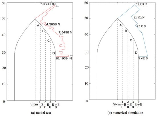 The experimental data of the Xuelong 2 (Figure 4) model ship sailing in the ice tank in the literature [37] are used in this paper for comparison with the results of the numerical model and to verify the reliability of the numerical model. The tests were performed in the new ice tank at the Ice Engineering Laboratory of Tianjin University, which is 40 (long) × 6 (wide) × 2.0 (deep) with a cooling system sending cold air from the top of the insulated room that can be cooled down to an air temperature of −22 °C. The shape of the model vessel was determined by reducing the linear dimensions of the icebreaker with a geometric scaling factor (set as 40 in the present tests). For the present tests, the inertial, gravitational, and elastic forces are important, so Froude and Cauchy scaling laws were used. The model ice used in this model test is urea ice. The model ice is made by adding a certain proportion of urea to the water and then freezing it. The urea added to the model ice is similar to the salt water bubbles in the prototype sea ice, which is equivalent to making the ice easier to melt, increasing the porosity of the model ice, decreasing the strength of the model ice, and better meeting the requirements of the scaling ratio. To obtain detailed information on the distribution and variation of the ice load on the bow area, a tactile sensor was used in the tests. In order to comparatively analyze the distribution of the ice load on the hull of the icebreaker during navigation, the bow of the ship (which can be targeted only at half the ship width due to symmetry) was divided into four critical areas, namely, areas A, B, C, and D, on average. The model test data acquisition is output from the test cells, each of which has a size of 31.2 mm × 10.0 mm. The numerical simulation data are output according to the four critical regions. Figure 9 shows the distribution of extreme ice loads in the bow region of the icebreaker, where (a) represents the model test results and (b) represents the numerical simulation results. From Figure 9, it can be seen that the numerical simulation and model test obtained similar characteristics of the extreme value load distribution. The extreme ice loads obtained from the numerical simulation and model test are 21.453 N and 19.7471 N for area A; 12.872 N and 4.3658 N for area B; 8.250 N and 7.5498 N for area C; and 8.625 N and 10.1939 N for area D. Although the numerical simulation results for area B are skewed larger than the model test results, the numerical simulation and model test results in areas A, C, and D remain similar. It can be proved that the numerical model for the icebreaking process of the icebreaking ship is reliable.