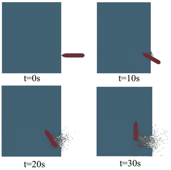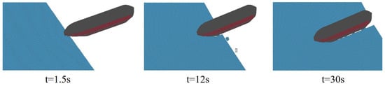 Figure 10 shows the numerical simulation of the icebreaking process in the straight navigation of the icebreaker. When s, the icebreaker comes into contact with the sea ice, and the forward momentum and self-gravity cause the sea ice to bend and compress. When the ice load accumulates to a certain value, the sea ice begins to break. It should be noted that ice failure occurs at the contact between the icebreaker and the sea ice [23]. The reason is that the ice field finite element model in this paper is simplified to some extent, and the physical environmental conditions of real sea ice are very complex, with many special properties such as salinity and density. When s, the bow of the icebreaker has already entered the ice field completely, and the bending deformation of the ice field reaches the maximum value. Due to the lack of buoyancy, the broken sea ice sinks along the bow of the icebreaker. When s, the icebreaker has fully entered the ice field, and a large amount of sea ice sinks. Some of the sea ice enters the body of the icebreaker along the bow. Radial and circumferential cracks are usually induced in the bow of an icebreaker during straight navigation. During the entire icebreaking process, the sea ice mainly undergoes compression and bending failure, and, from time to time, this is helped by the shear failure of the ice, which is similar to the actual icebreaking process.