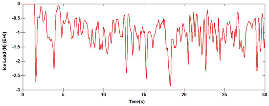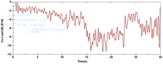 Figure 11 shows the time history of the overall ice load on a straight-running icebreaker in a stochastic ice field. As seen from the figure, the icebreaker comes into contact with the stochastic ice field at s, and the ice load starts to act on the icebreaker. With time, the ice load gradually accumulates and reaches its first peak at s, followed by an unloading phenomenon, and a new cycle begins. The peak ice load during the whole process is N. The thickness distribution of the sea ice has certain stochastics, which makes the variation trend of the ice load closer to the real situation, and each peak ice load in the process of icebreaking has significant differences.