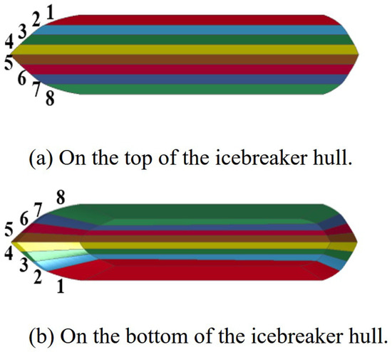 When an icebreaker is breaking ice in polar regions, the local ice loads on different parts of the icebreaker can reflect the force situation in different positions on the hull, which is also of great significance for the design of the hull. During straight-line movement in an ice field, the bow of the icebreaker is the main part that collides with sea ice, and the force state of the hull and stern during the icebreaking process will not change significantly. Therefore, according to the characteristics of the force under straight-line movement, the icebreaker is divided into eight different areas, as shown in Figure 14. When the icebreaker is turning in an ice field, the force situation of the icebreaker is completely different from that during straight-line movement, and the bow, hull, and stern will all participate in the icebreaking process. Therefore, according to the characteristics of the force under the turning state, the icebreaker model is divided into 20 different areas, as shown in Figure 15.