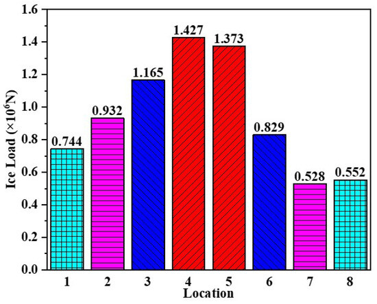 Figure 16 shows the distribution of maximum ice loads on different parts of the icebreaker while moving in a stochastic ice field. Symmetrical parts are annotated with the same graphics. As can be seen from the figure, the maximum ice load occurs at position 4, with a value of N. The distribution trend of the ice load shows high middle and low ends, which is caused by the dominant role of the middle part of the hull in the icebreaking process.