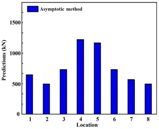 The asymptotic method was used to estimate the ice load extremes in regions 1–8 of the icebreaker, and the estimated results are shown in Figure 18. From the figure, it can be seen that the variation trend of the estimated results has a certain symmetry. The estimated results first decrease from the middle of the bow towards both sides and then become flat at regions 1 and 8. Regions 1 and 8 are transition zones located at the junction of the bow and hull and need to have a certain resistance to ice loads.