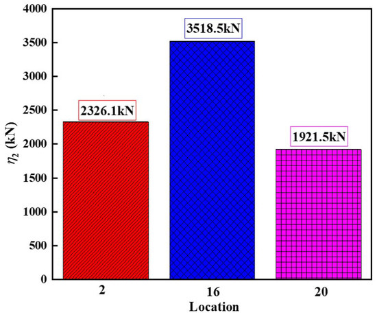 Figure 19 shows the estimated extreme ice loads for regions 2, 16, and 20 of the icebreaking ship in a rotational state. From the figure, it can be seen that the extreme ice load in region 16 located at the midship is greater than those in regions 2 and 20 located at the bow and stern. The estimated result in region 16 is 51.3% higher than that in region 2 and 45.4% higher than that in region 20. The main reason is that in the rotational process of the icebreaking ship, the failure mode of the sea ice at the midship is dominated by compression failure, leading to a larger value of ice load. At the bow and stern, there is a certain inclination angle forming a conical hull structure, making the failure mode of the sea ice dominated by bending failure. The extreme ice loads at the bow and stern are almost the same, with a difference of 17.4%.