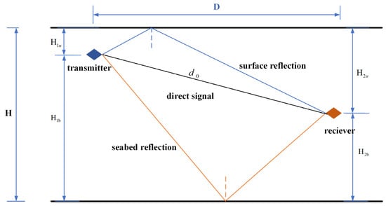 The underwater acoustic channel can be conceptualized as a slow time-varying coherent multi-path channel. In an ideal channel, the sound field has an equal velocity distribution, and all reflections are approximately mirror reflections. Aside from the direct signal, there are also surface reflections, seabed reflections, and secondary reflections between the surface and seafloor in the received signals. Based on the ray acoustics [], all reflections are assumed to be specular reflections, disregarding the impact of sound line bending. Then, the ideal multipath channel model is depicted in Figure 1.