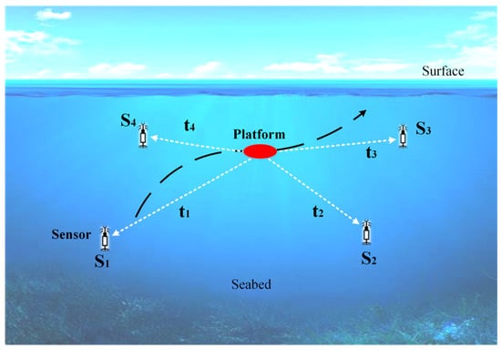 As ocean exploration deepens, acoustic localization is used in an increasing number of domains underwater [,,]. Typically, underwater acoustic localization systems comprise a platform and several sensors. Sensors are organized into a sensor network based on a certain geometric configuration, and communicate with the platform through acoustic signals. Precise determination of the platform location can be achieved by measuring the parameters of the direct sound signals.